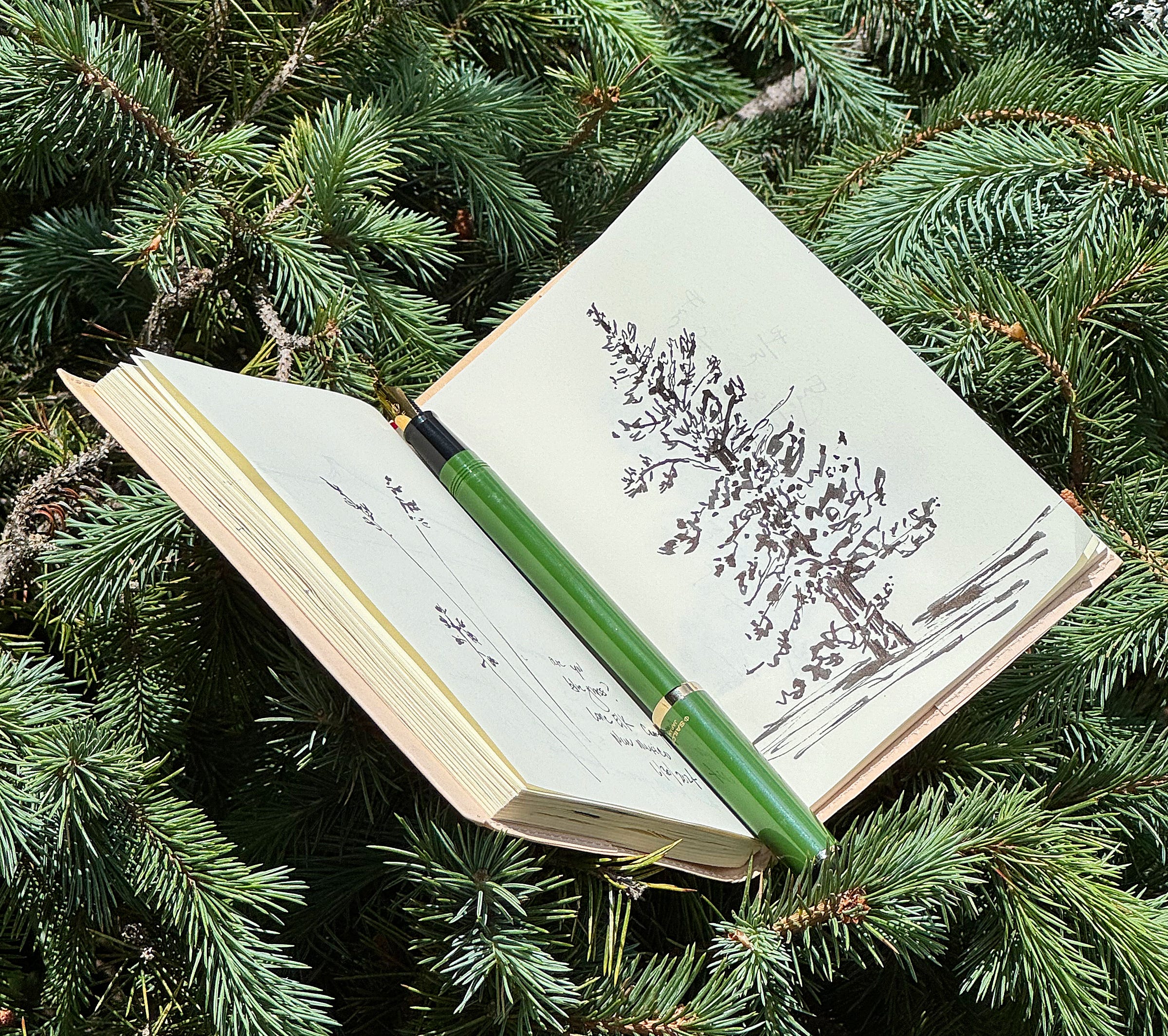I started off doing some sketches with pen and ink to get the feel for the structures of the trees — this is a Douglas Fir in camp — the sketchbook was perched on a spruce for the photo lol!