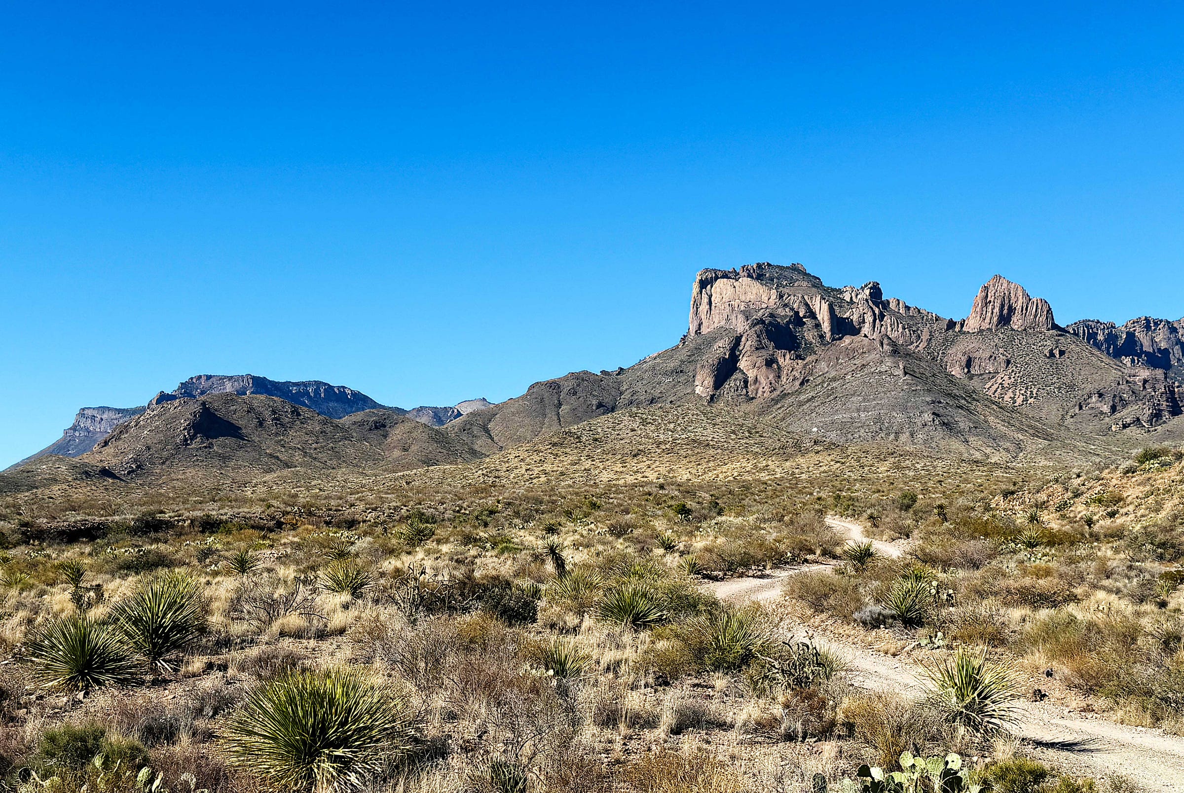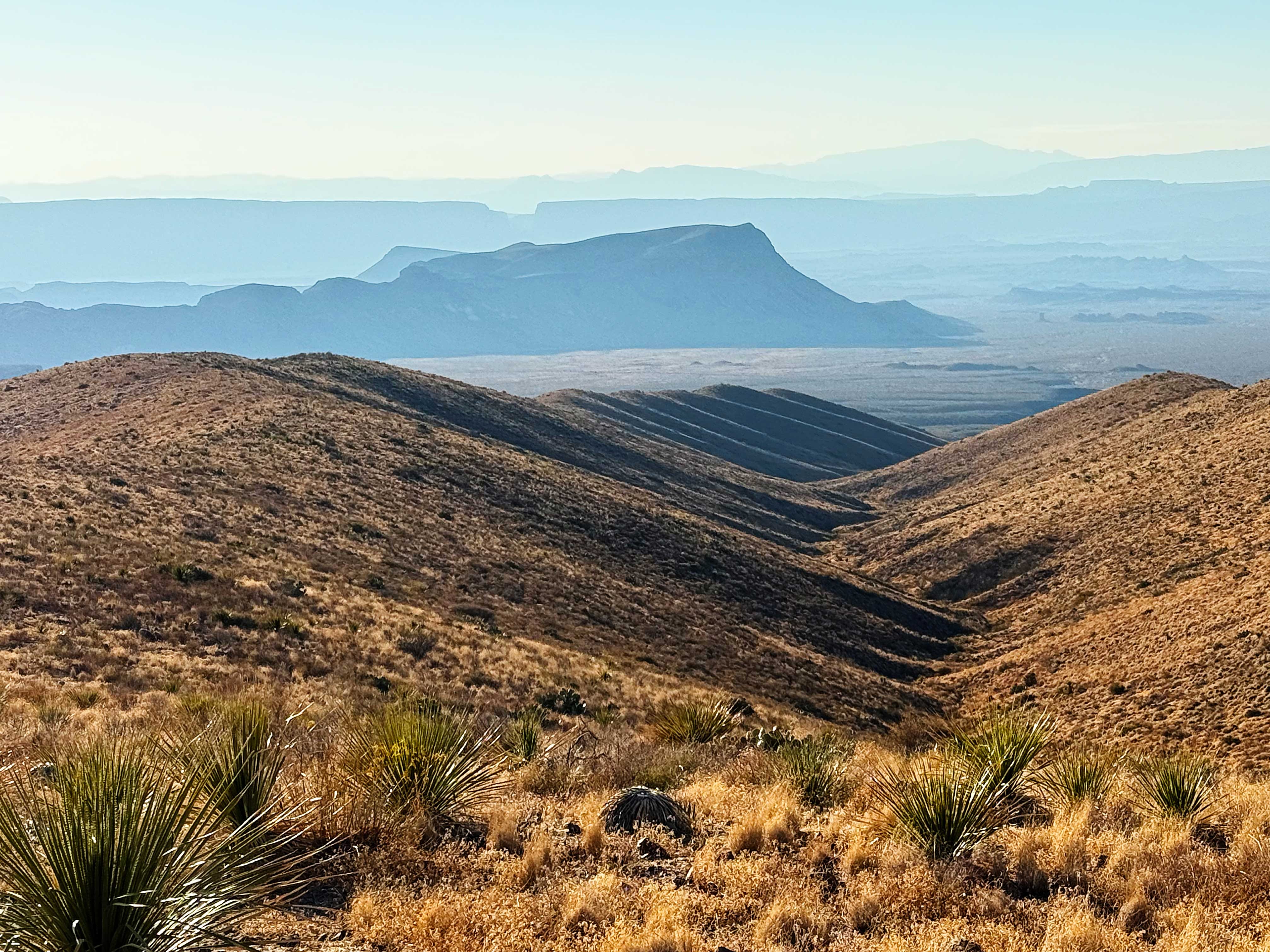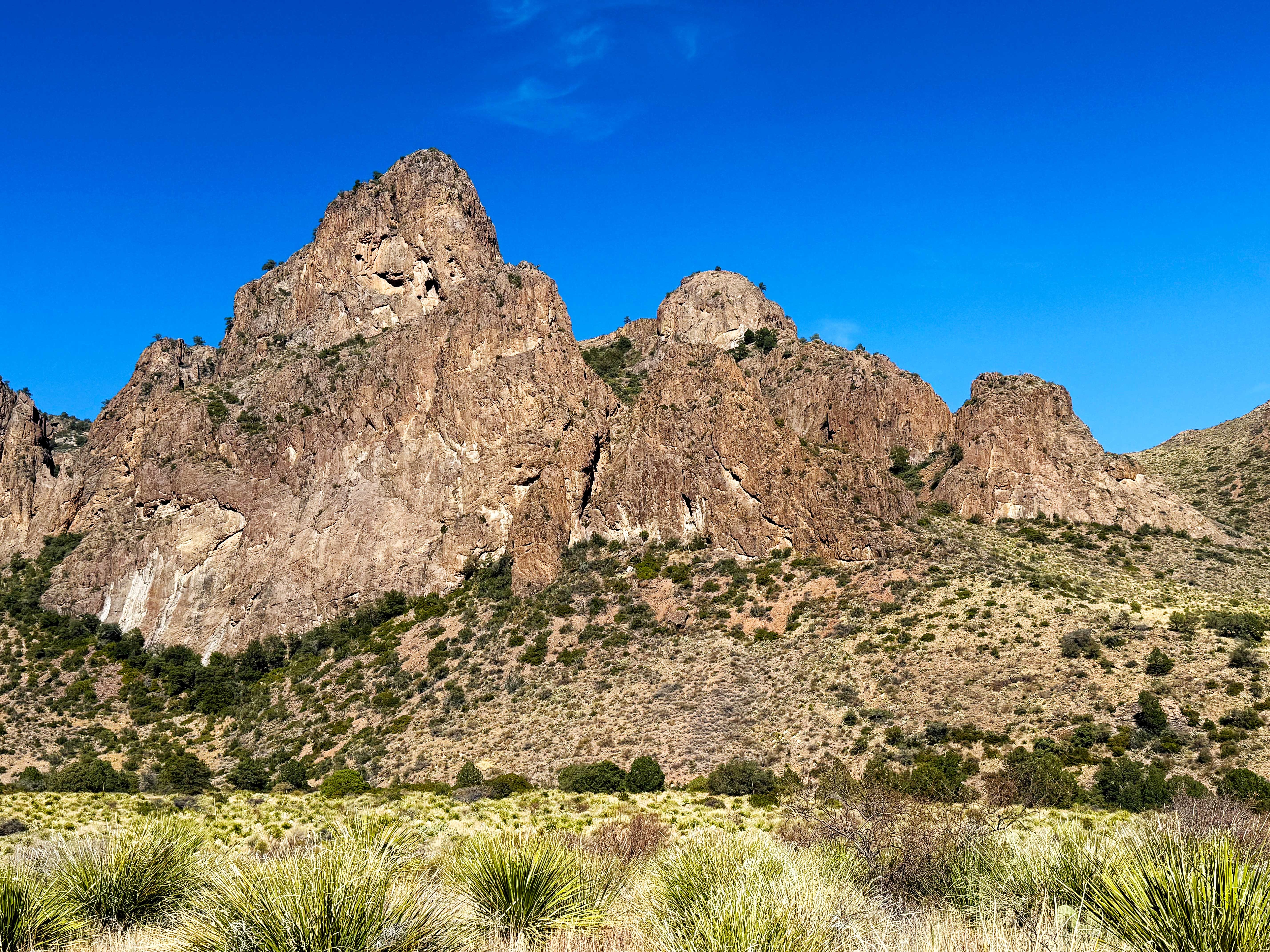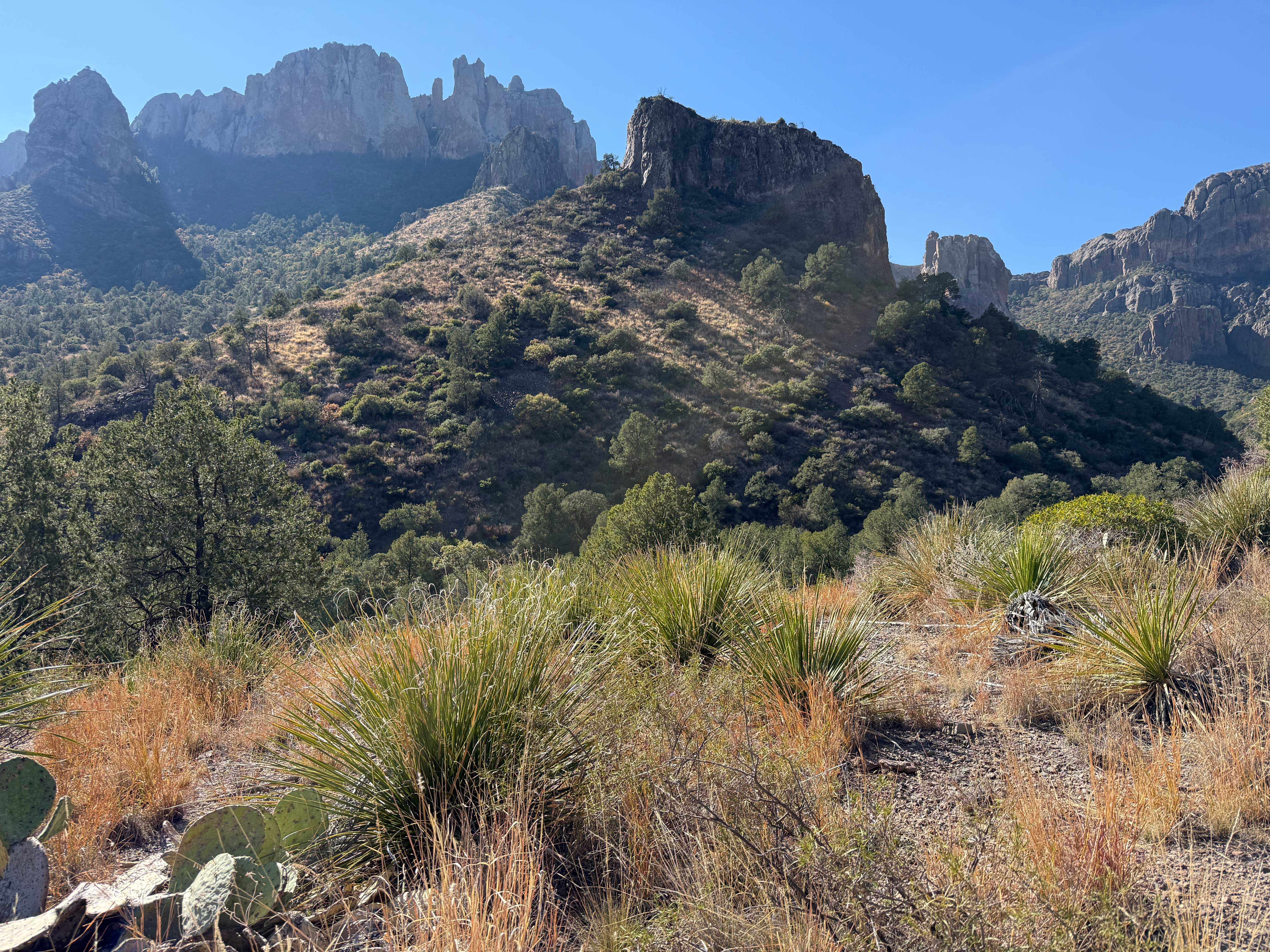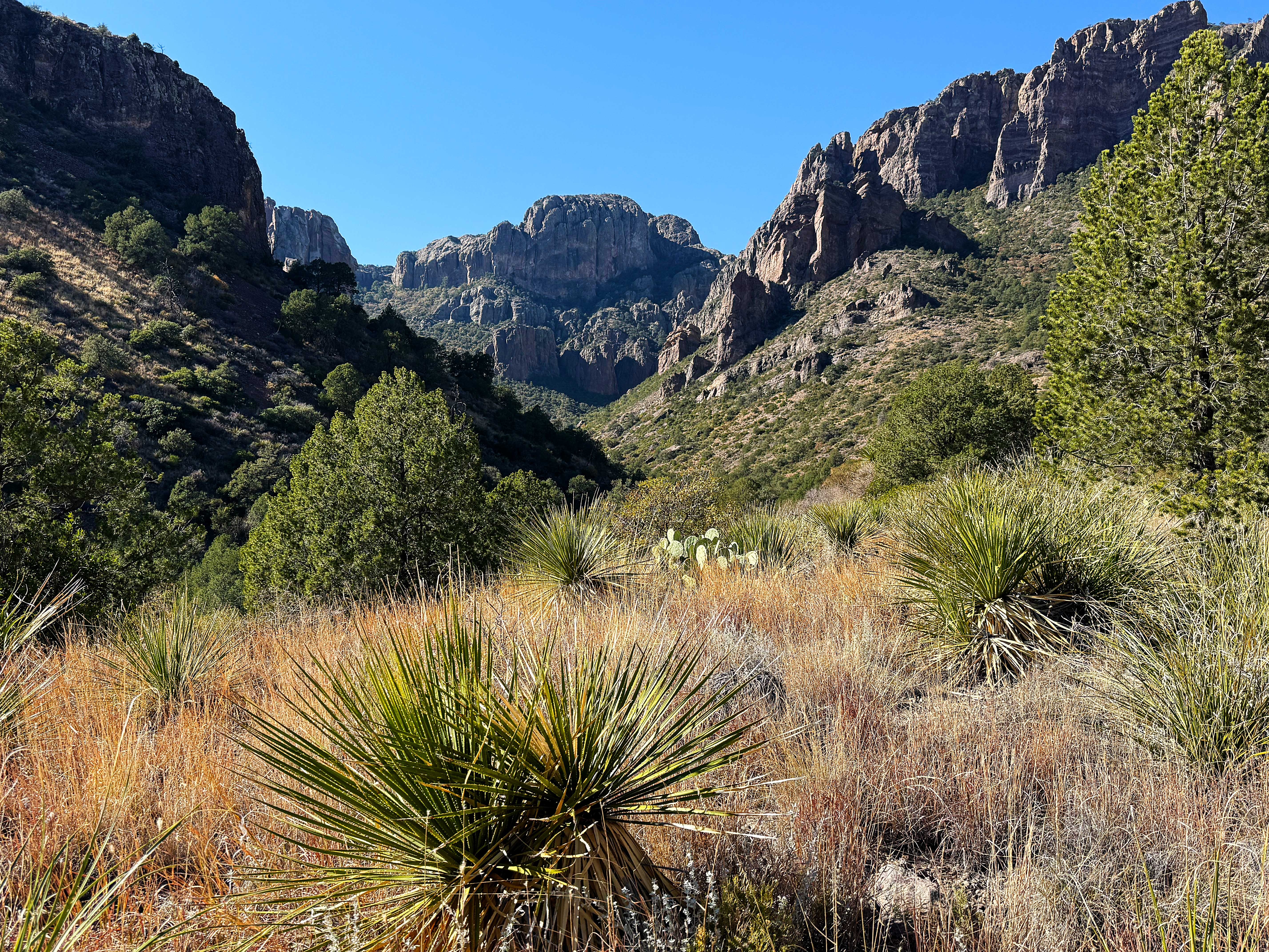 This is one of our favorite hikes in all of Big Bend. It starts out around 4,300 feet in elevation in a desert sotol grassland and then gently continues up 1,000 feet in 2 miles through pines and oaks and ends at a pour-off — where the water pours off the mountain when it rains.