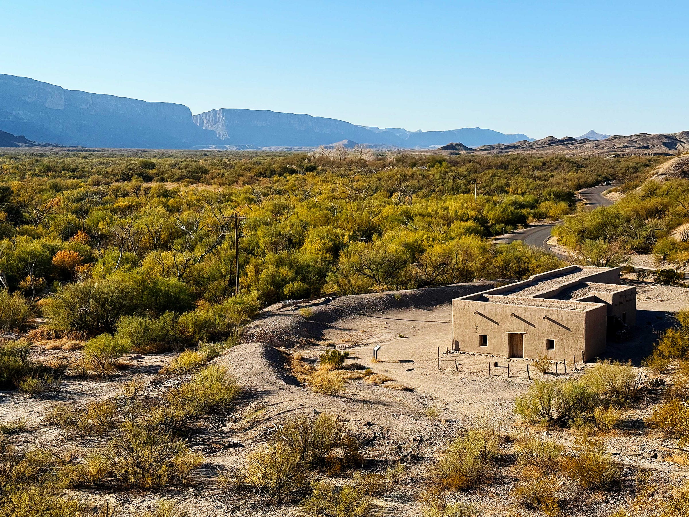 It has amazing views of the Sierra del Carmen range across the Rio Grande in Mexico: