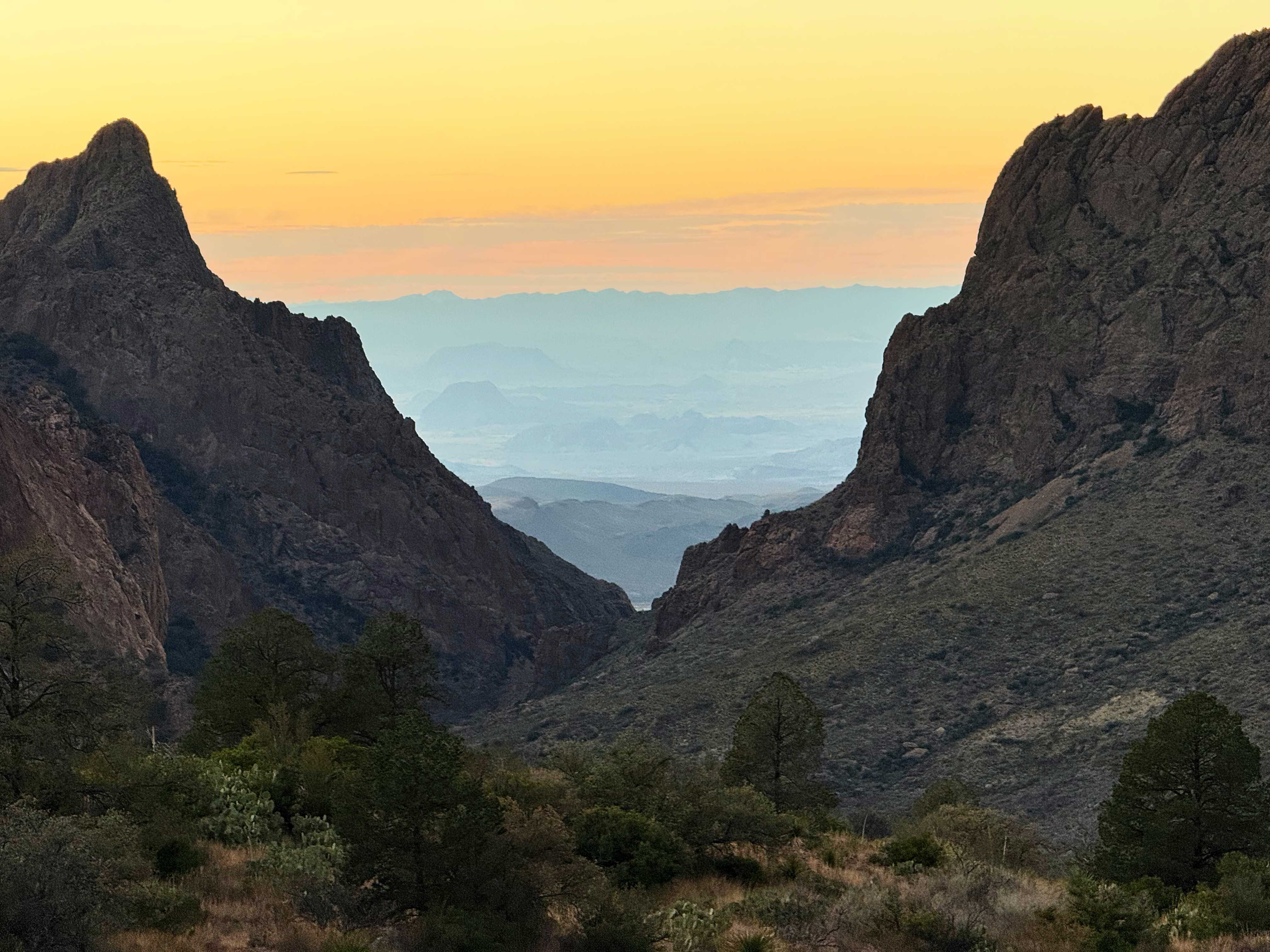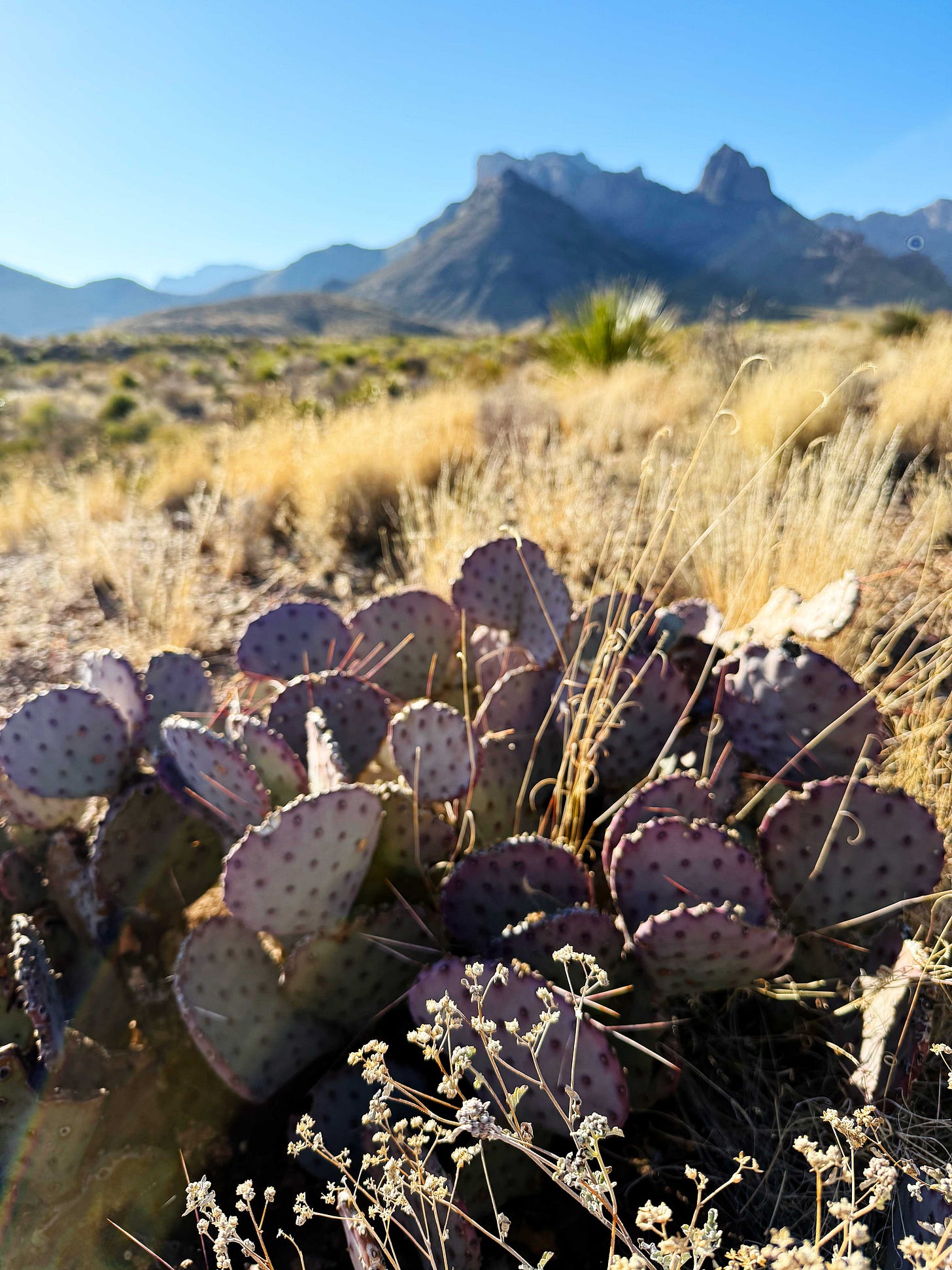 All too soon it was time to hike back to the van. The way back has excellent views of the Sierra del Carmens, and J came up with an awesome poem one time about how the mountains touch the sky and merge into one — but we can’t remember it, darn.