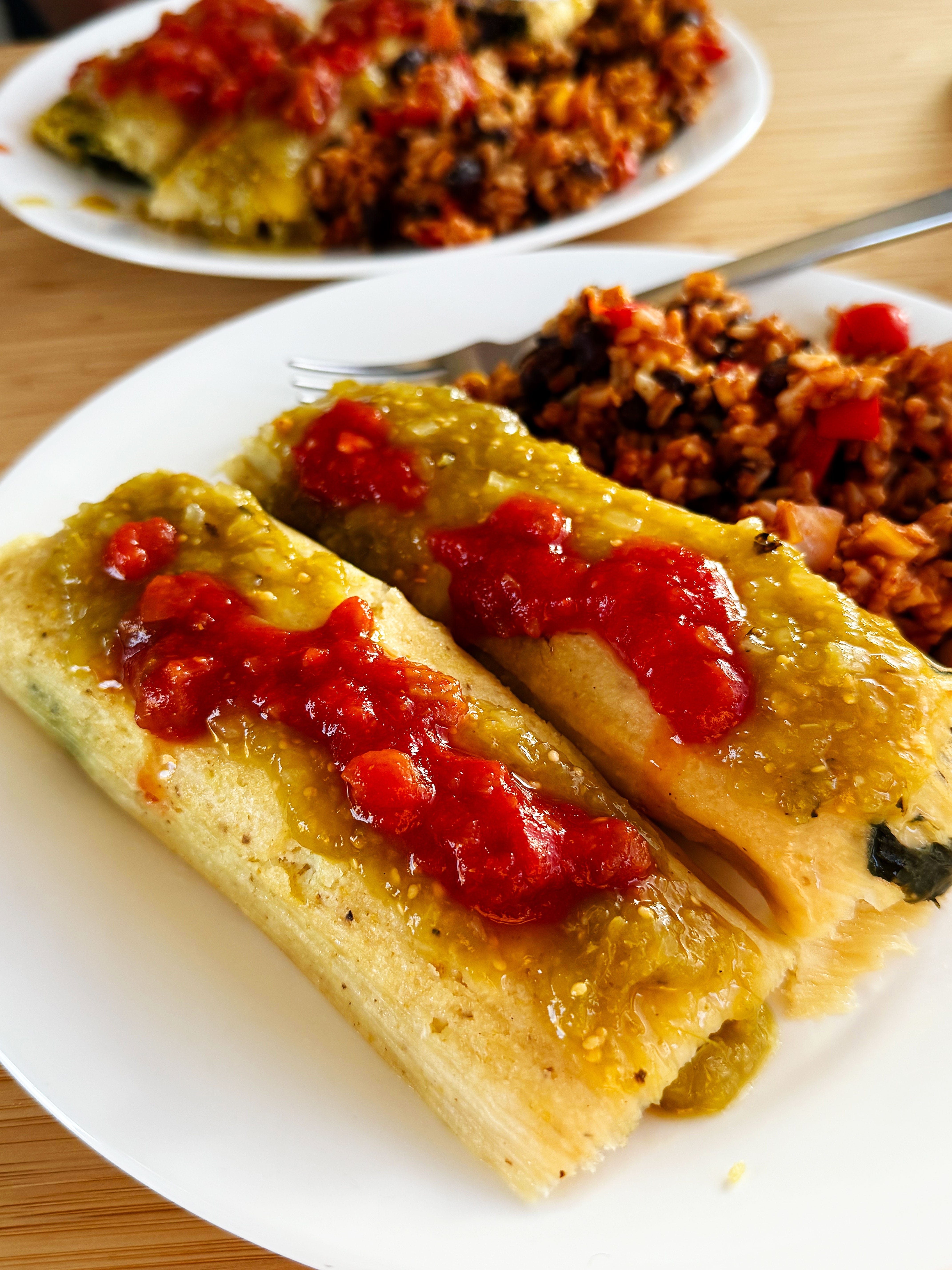 For our New Year’s feast we had spinach tamales from Tamale Addiction that we got at the Texas Farmers Market when we were visiting Austin and kept in the freezer.