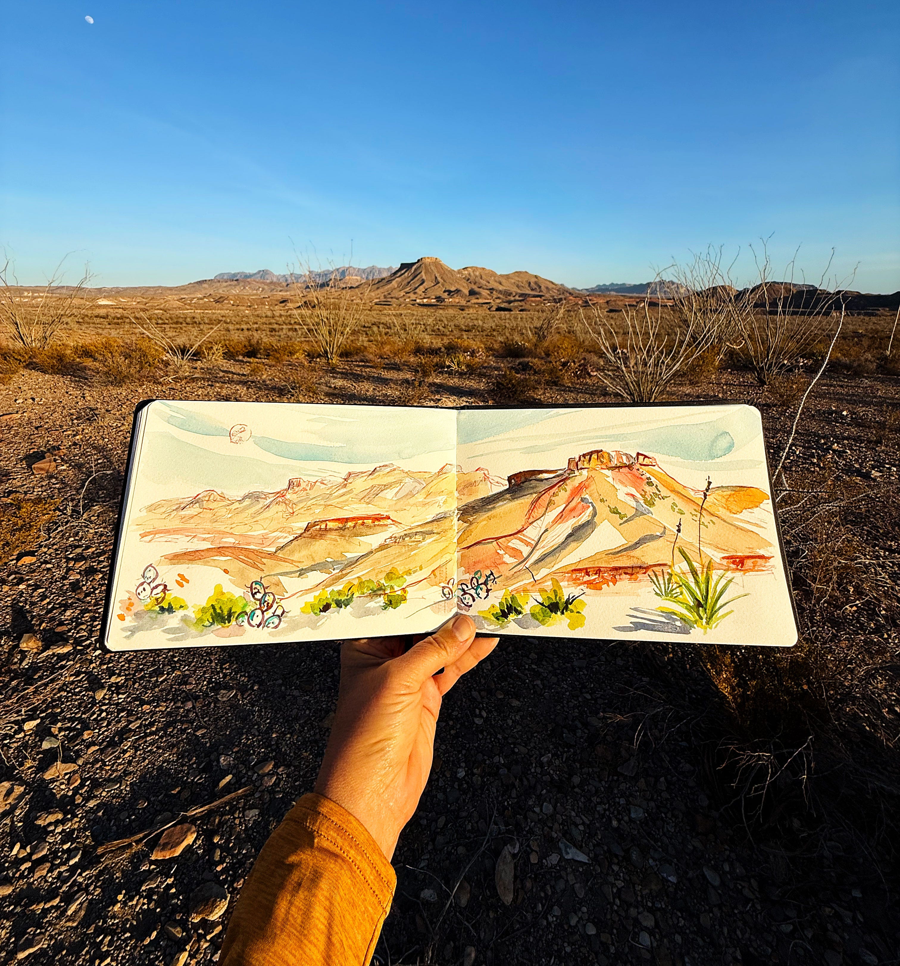 I played with some new pink ink that I got recently and did a sketch of the mountains from camp, playing with color and shapes and just splashing on color and having FUN — all while watching the moon rise above the mountains.