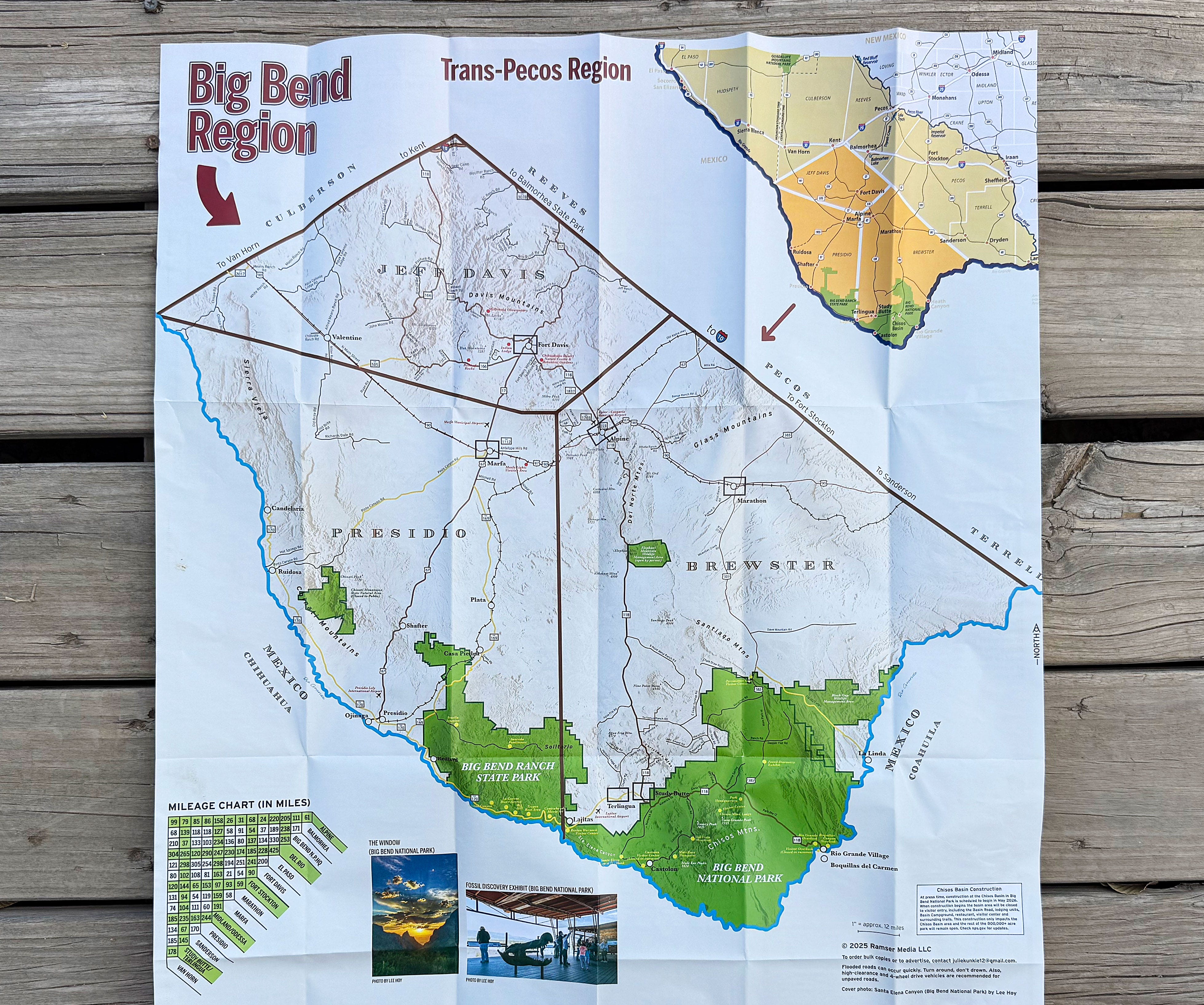 Here’s a map so that you can get oriented — we started in the bottom right in the green of Big Bend NP, then drove north out of the park to Marathon, followed by a stop in Alpine, and ending in Davis Mountains SP in Fort Davis.