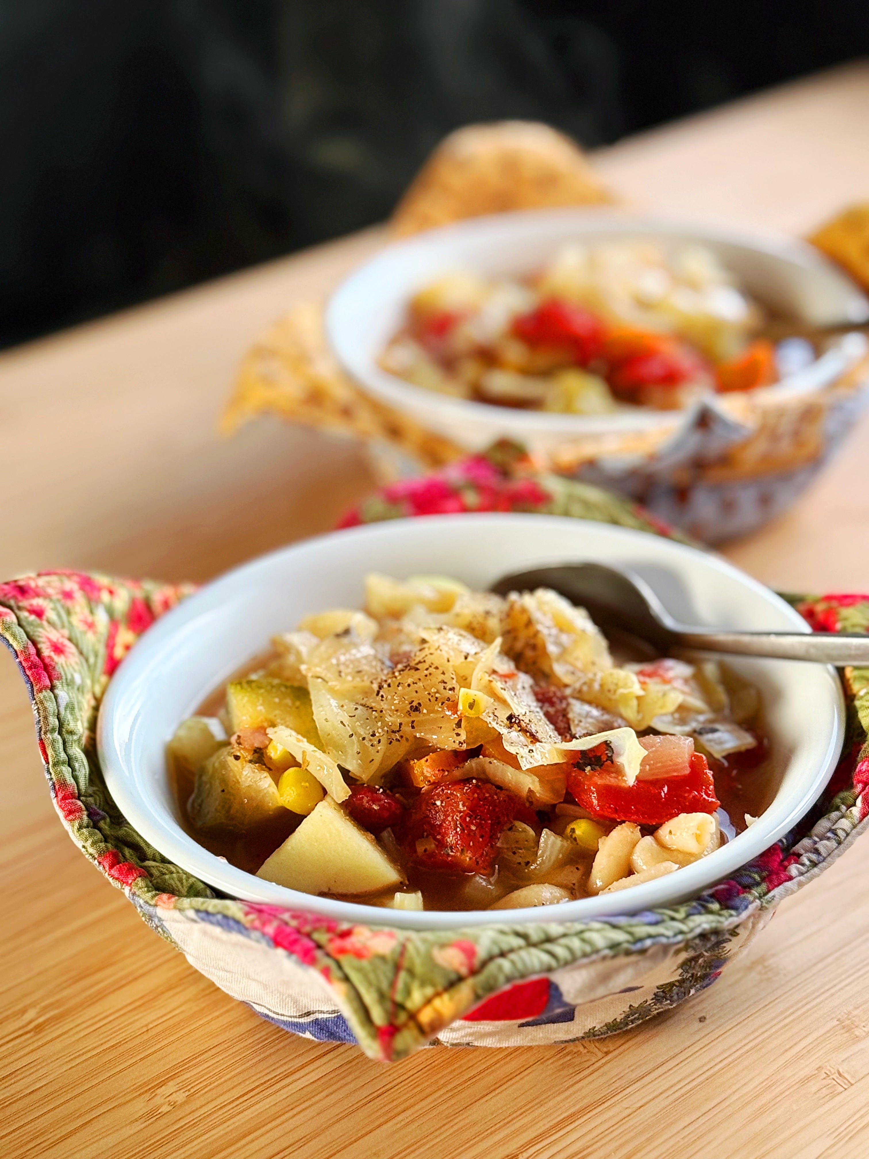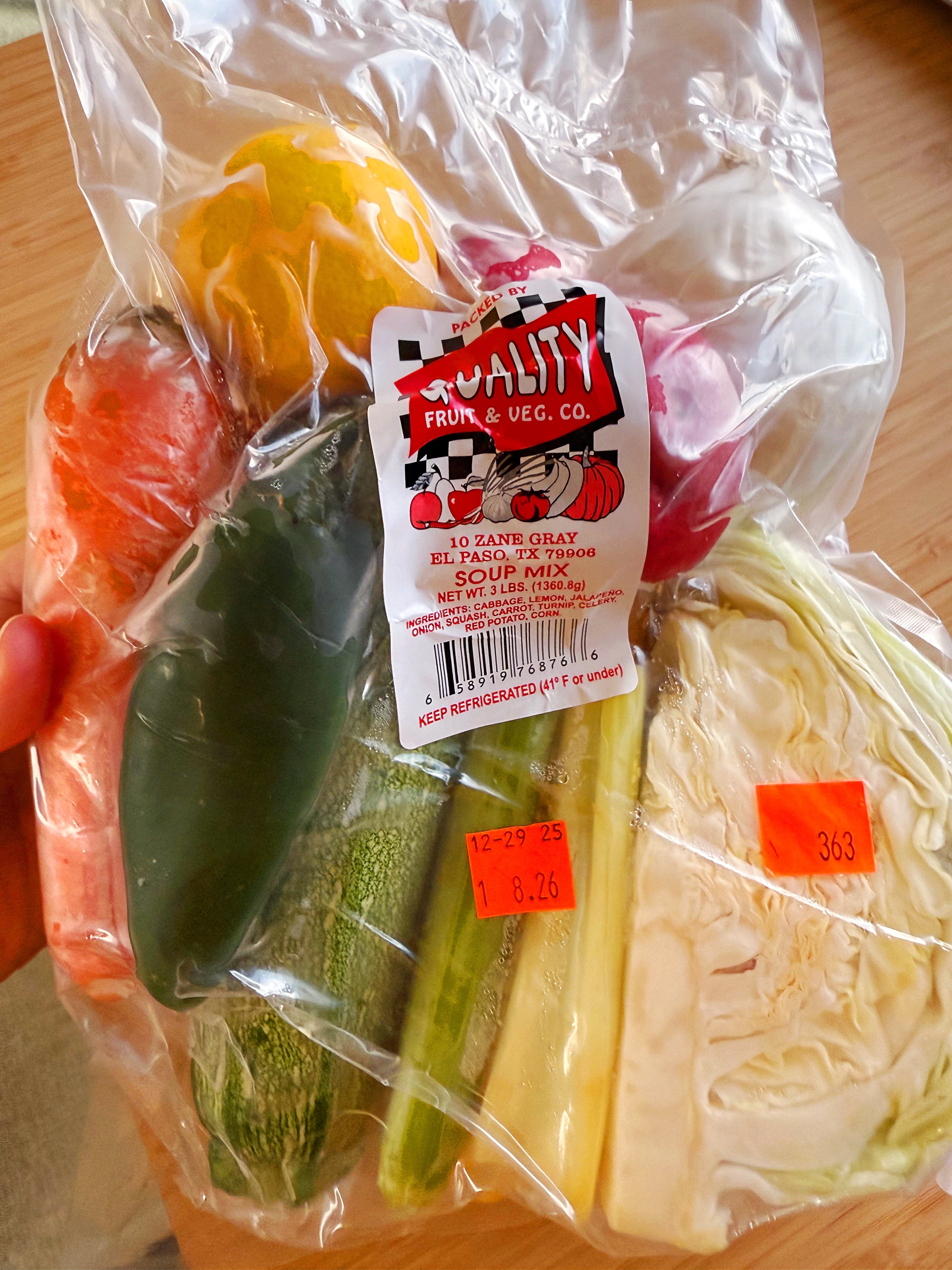 The soup mix had a jalapeño, red potatoes, carrots, celery, and onion, cabbage, squash, corn-on-the-cob, and even a lemon in it. I added some fire roasted tomatoes, kidney beans, seasoning and macaroni and we had a cozy bowl of warm goodness in no time.