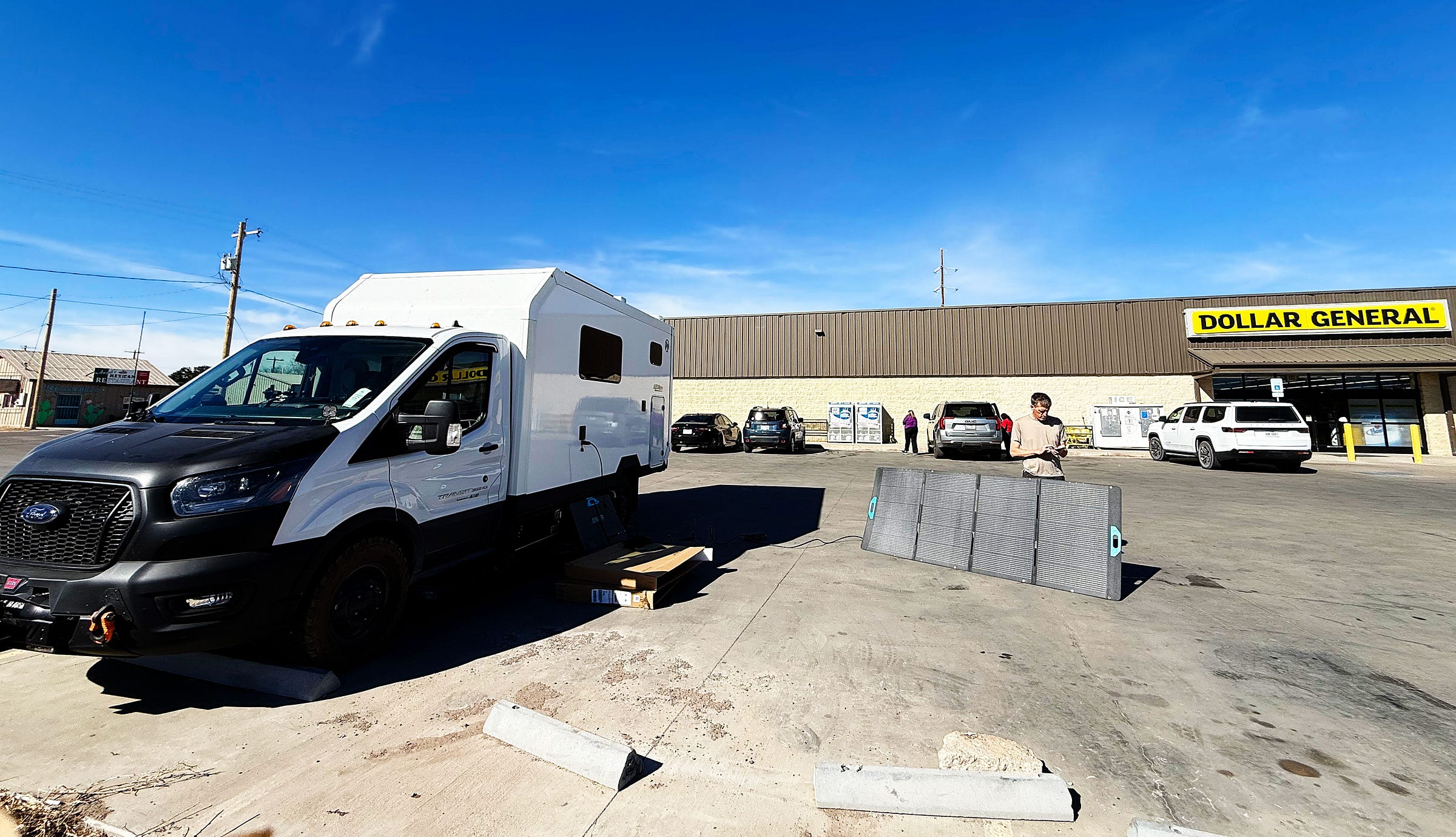 Tuesday we went to the Dollar General in Marfa, Texas to pick up portable solar panels that were replaced under warranty and shipped there via FedEx — we got some strange looks when we tested them in the parking lot! One guy stopped by to see if we were setting up for an event!