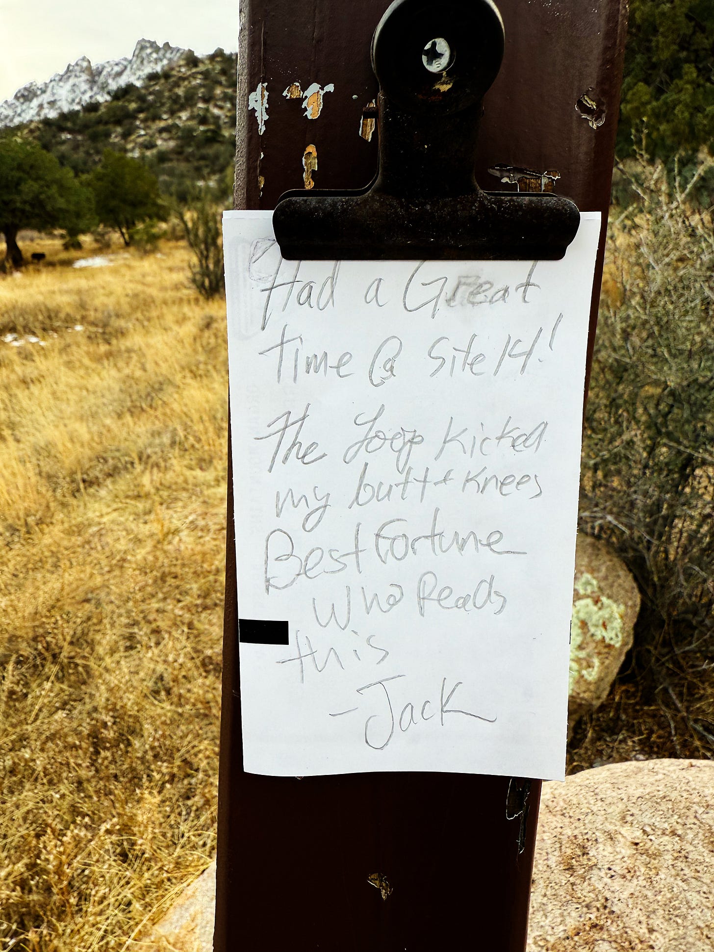 We went for a walk around the campground on Thursday and saw this note at site 14 — totally cracked us up! Can confirm it’s accurate about that trail!